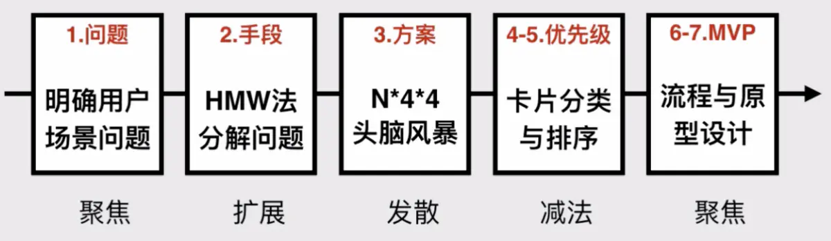 HMW目的:在一定的时间内,以头脑风暴的方式,最大范围地搜集产品的各种可能性,然后抽象地整理出这些想法背后所隐藏的核心概念和产品需求,快速梳理出正确的产品设计方向,之后将想法转化成可视的手稿和线框图,最终变成产品雏形。